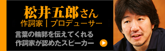 | ●松井五郎(作詩家、プロデューサー)プロフィール:ヤマハ・ポピュラーソングコンテスト出場をきっかけに、1981年にチャゲ&飛鳥の2ndアルバム「熱風」を作詞。以後、安全地帯・氷室京介・ハウンドドッグといったニューミュージック、ロック系のアーティストを中心に作品提供を行う。その作品数は、2000曲を優に超え、現在もクレイジーケンバンド・柴崎コウ、V6などのアーティストの作詞を手がける他、表現集団「銀河朗読団」を主宰する。 公式サイト |